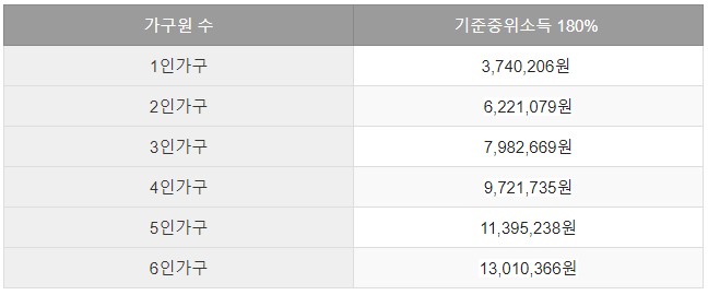 아래 표에서의 금액은 가구원별 월 소득 합산 × 180% 한 것이다.